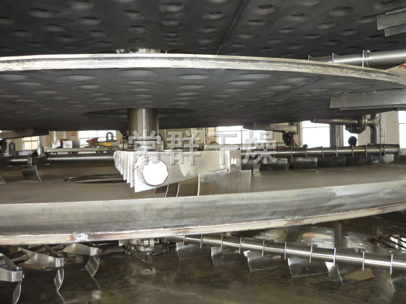 濕物料自加料器連續(xù)地加到干燥器上部第一層干燥盤上,帶有耙葉的耙臂作回轉(zhuǎn)運動使耙臂作回轉(zhuǎn)運動使耙葉連續(xù)地翻抄物料。物料沿指數(shù)螺旋線流過干燥盤表面,在小干燥盤上的物料被移送到外緣,并在外緣落到下方的大干燥盤外緣,在大干盤上物料向里移動并從中間落料口落如下一層小干燥盤中。大小干燥盤上下交替排列,物料得以連續(xù)地流過整個干燥器。中空的干燥盤內(nèi)通入加熱介質(zhì),加熱介質(zhì)形式有飽和蒸汽、熱水和導(dǎo)熱油,加熱介質(zhì)由干燥盤的一端進入,從另一端導(dǎo)出。已干物料從最后一層干燥盤落到殼體的底層,最后被耙葉移送到出料口排出。濕份從物料中逸出,由設(shè)在頂蓋上的排濕口排出,真空型盤式干燥器的濕氣由設(shè)在頂蓋上的真空泵口排出。從底層排出的干物料可直接包裝。通過配加翅片加熱器、溶劑回收冷凝器、袋式除塵器、干料返混機構(gòu)、引風(fēng)機等輔機,可提高其干燥的生產(chǎn)能力,干燥膏糊狀和熱敏性物 料,可方便地回收溶劑,并能進行熱解和反應(yīng)操作。